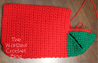 Once that part was done you fasten off and change colors to green for the heel. This part was easy enough to understand for me, it just seems a little weird. You skip most of the stitches and then attach and sc in the last 10 st. Then you bring the other side of the stocking leg around and sc in the first 10 st. This connects the stocking leg together so you can crochet the heel. The weird part is having the two edges not connected. I just wonder why not just do a circle (like in a hat) instead of having to sew the edges. I don't have an answer to that so if anyone knows just let me know. : )